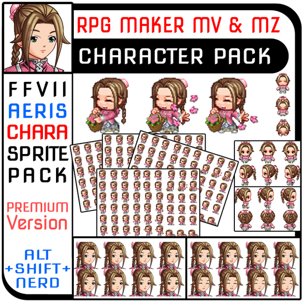 This is a Complete Character Pack recreating Aeris (also known as Aerith) of Final Fantasy VII fame! You get all you need to add this character to any game! Designed in the format of RPG Maker MV and RPG Maker MZ, this can also be used in other game engines (with some editing on the purchaser's part).