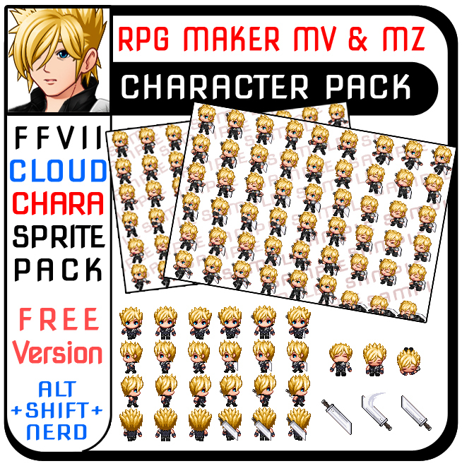 This is a Complete Character Pack recreating Cloud of Final Fantasy VII fame! You get all you need to add this character to any game! Designed in the format of RPG Maker MV and RPG Maker MZ, this can also be used in other game engines (with some editing on the purchaser's part).